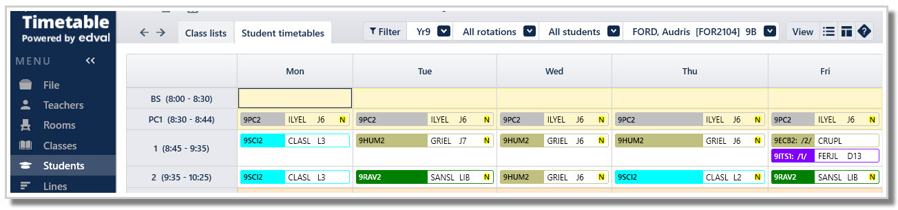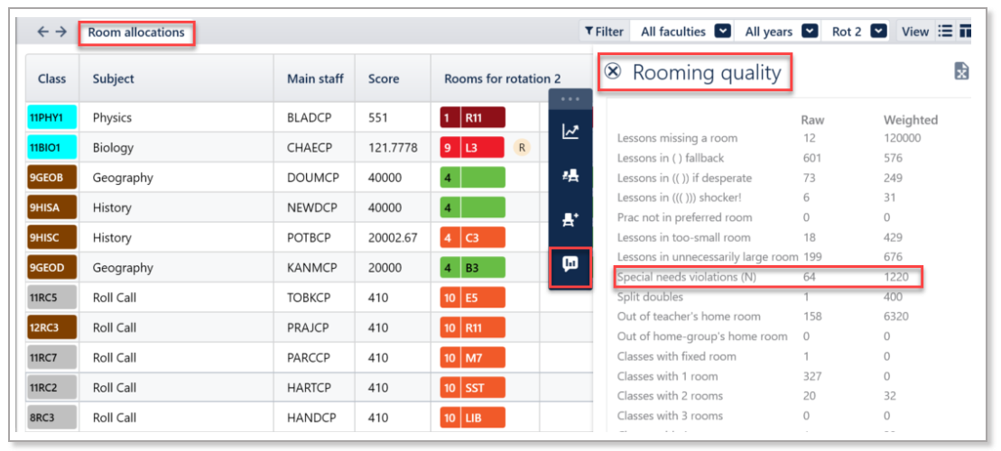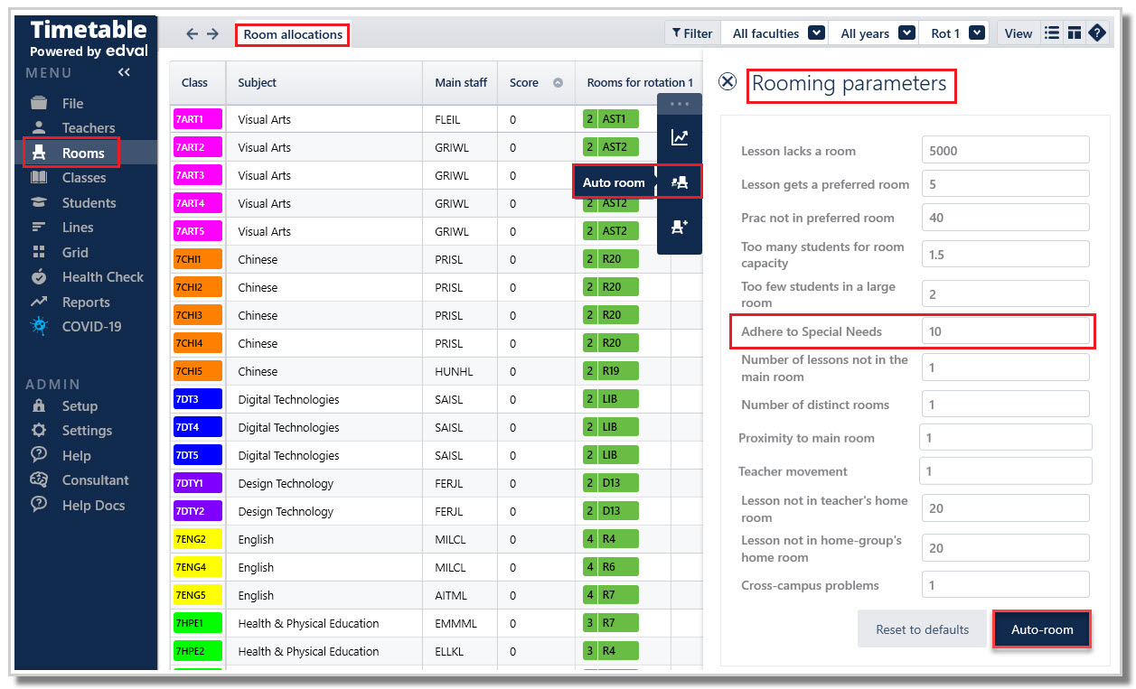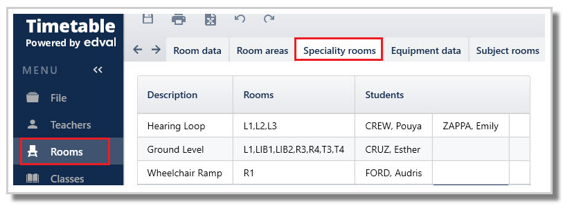 Speciality rooms can be set up to accommodate students with special education requirements e.g., students using a hearing device might need rooms with hearing loops or student using a wheelchair might require ground level rooms or rooms with ramp access. As Edval better understands which rooms are suitable for students with special education requirements, the auto - room algorithm will work more effectively, by assigning their classes to the appropriate rooms.