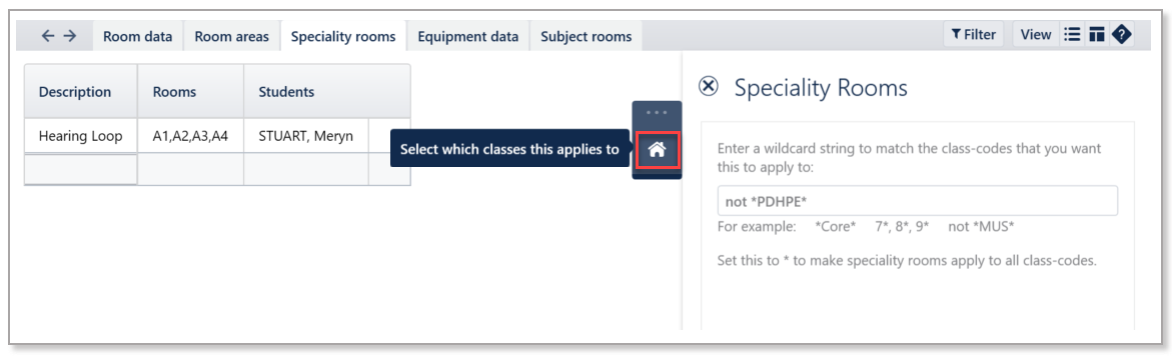 In some cases, not all classes need a speciality room. To specify which classes do require the speciality rooming or to exempt other classes, open the right hand side slide-in and enter the required class codes. Note that a wildcard string may be used. Use 'not' to exempt classes from speciality rooming, e,g, 'not *PDHPE*. This wildcard string will exempt all classes that include PDHPE in the code. Use the * only to make speciality rooming apply to all class-codes.