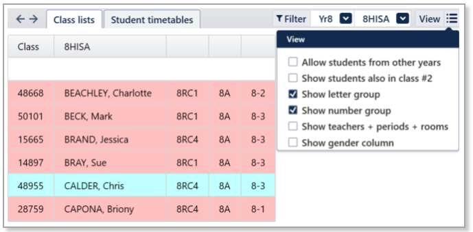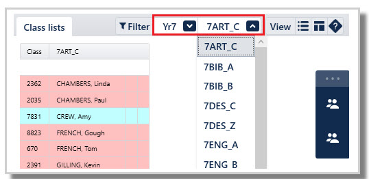 Select the year level and the class from the Filter menu to view a class list.