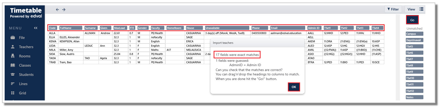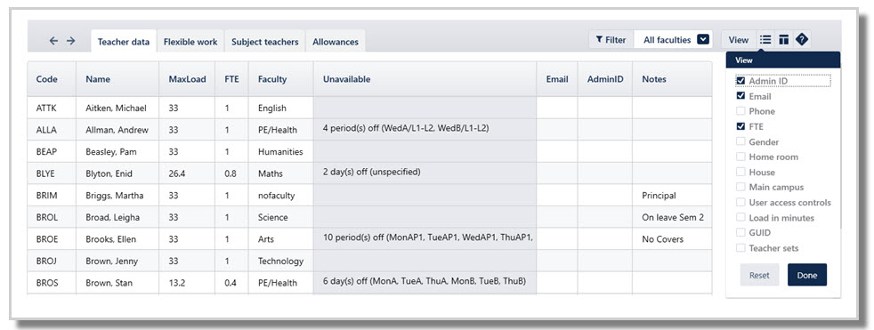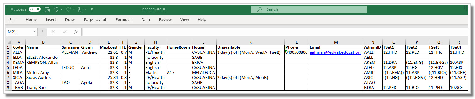 - TSET1, TSET2...TSET12: The subjects a teacher can teach. Format is year level followed by a hyphen followed by the course code, e.g. 11:ENG.