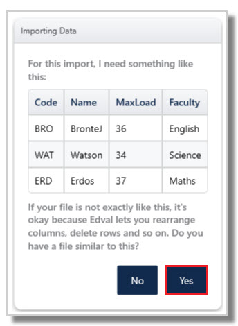 Select 'Yes' if your file looks similar to the Importing Data pop-up.