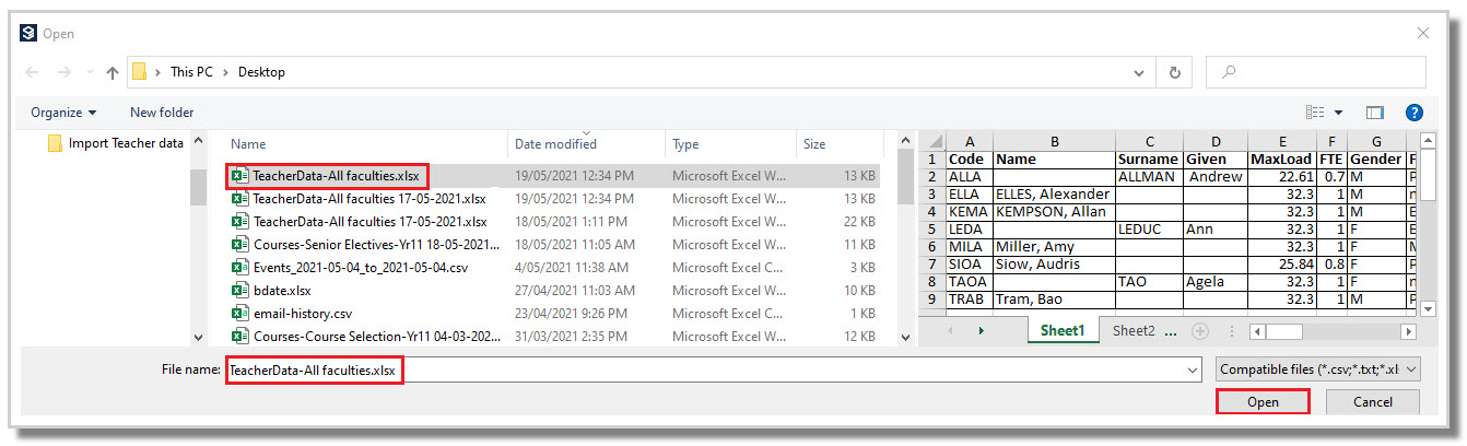 - FullName: The preferred format is: 'SURNAME, First name' so that sorting will be done on the surname. E.g. ‘ALLEN, Richard’. In the absence of a name, the Teacher code will be used.
