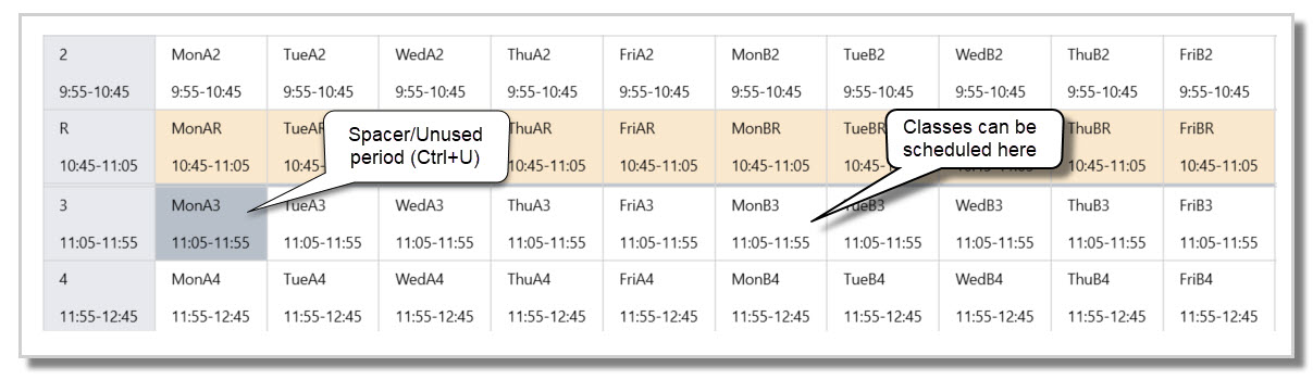 - Initially assume (and code) the assembly period as 100% occupied to the full period in week A (of the period to be split). Alternatively, go to Admin > Setup > Grid structure and mark the period as Spacer/Unused (Ctrl+U). This leaves the matching period to be split as capable of taking any class whatsoever - without leaving a gap.