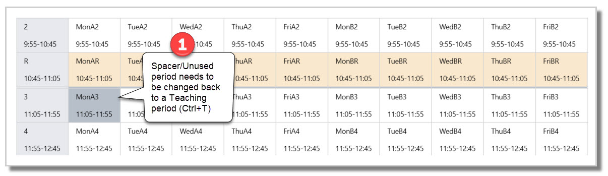 - Once the timetable has been fully constructed you now have Assembly (or a Spacer/Unused period) in one period, and a range of teaching classes (suitable to be split) in the corresponding period of the other week. Delete the Assembly classes or revert the Spacer/Unused period back to a Teaching period, Setup > Grid structure > Teaching period (Ctrl+T)