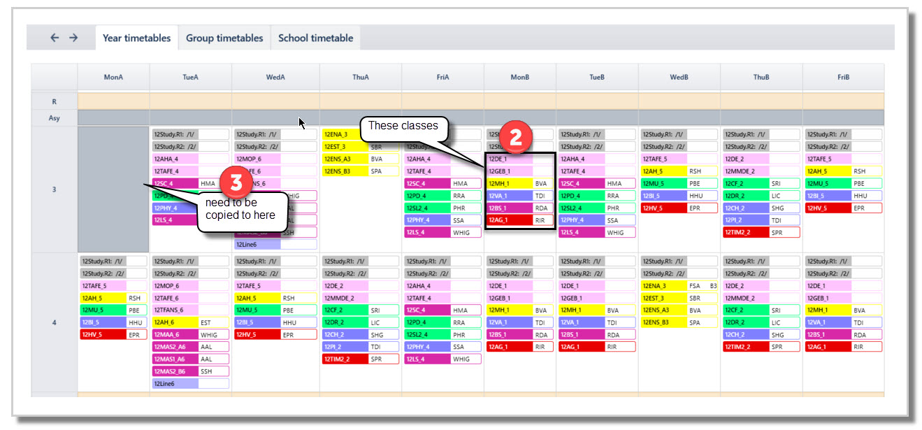 - In Classes > Class data (F6) > Period place an entry such as Mon3 against all classes which are running in the split/half period. This is a requirement which will both flag these classes as different from others, but also assist in keeping the split periods in their correct location on both weeks.