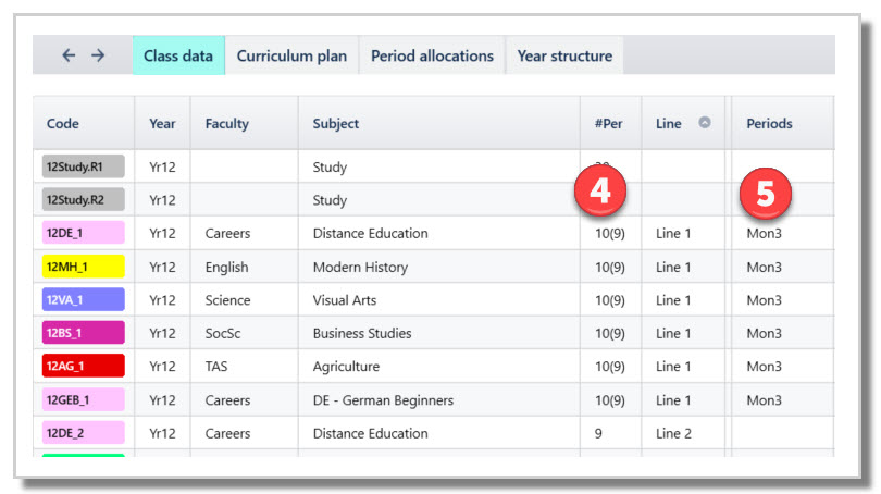 - You may use the Classes > Class data (F6) > Periods cell to artificially block or encourage specific classes that you may want to especially run across the split period. An example of this may be languages, where you want increased contact frequency, as opposed to a practical subject with a reduced duration may be inappropriate.