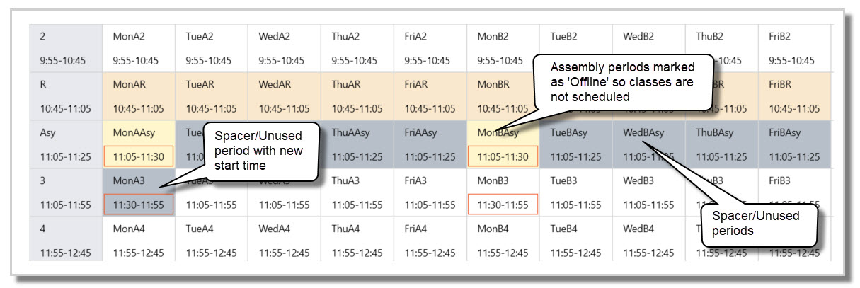 - If you particularly wanted to see the word Assembly shown on timetables in the relevant place on the grid, you would simply insert an additional period row in Setup > Grid structure, then mark each period as a Spacer/Unused period, except for the Assembly period. Adjust bell times for the days with the assemblies.