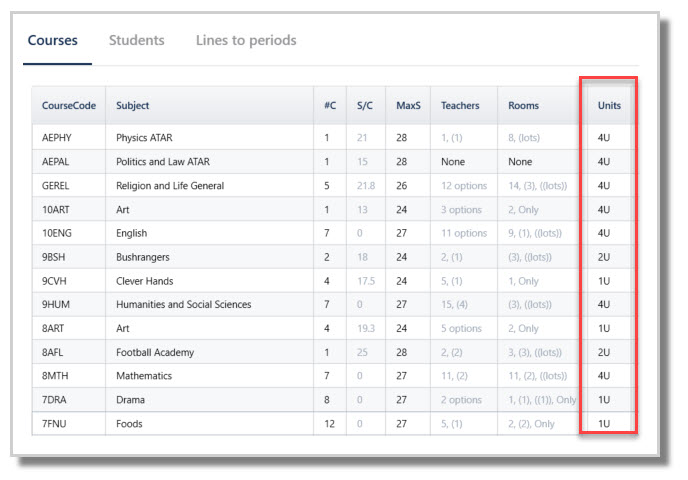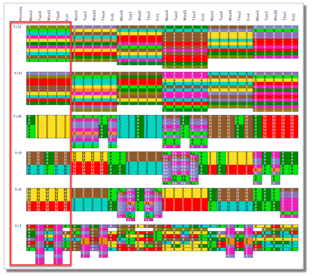 - 4, if you are running 'sub lines' such as we see in Year 9 > Line 4 in the image above (Line 4 spans 5 periods overall, but Year 9 has 2 period lines. Therefore, we can fit two Year 9 lines under a single senior line)