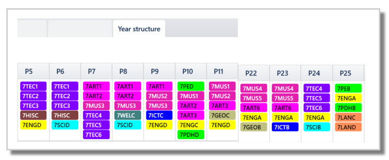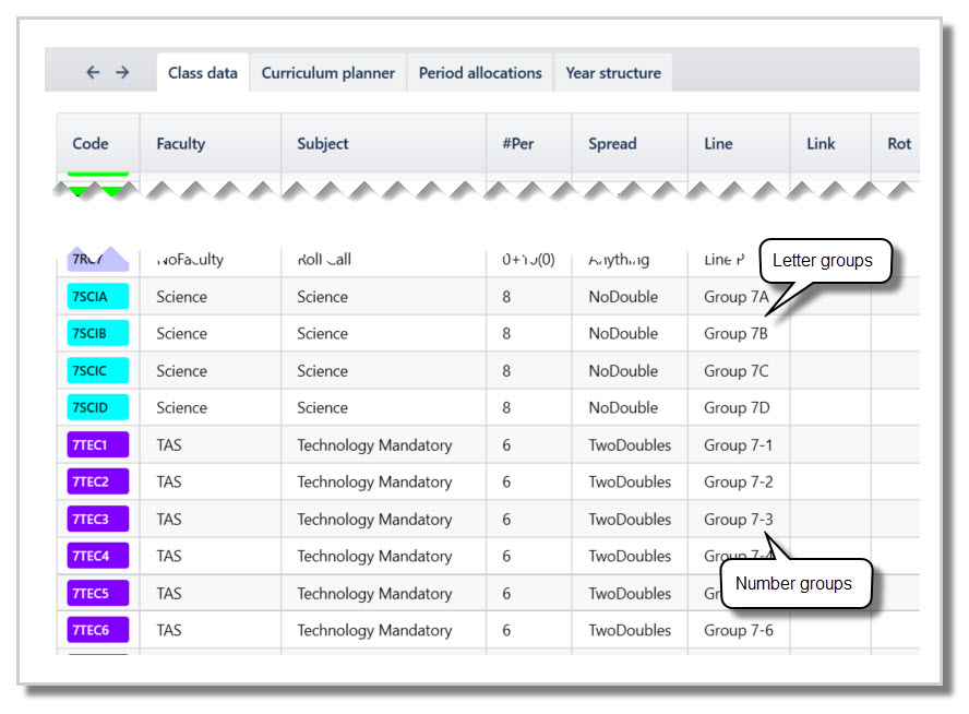 - Similarly, it could be that 7-1 has TEC, 7-2 has TEC, 7-3 has Art, 7-4 has MUS, 7-5 has TEC and 7-6 has TEC; as long as all 6 number groups each have a class running in the same period. In this example, for this particular period, the school would need to have 4 TEC teachers available to take classes in the one period. For many schools this is not feasible, as resources such as specialist teachers and rooms are restricted.