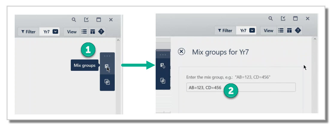 A string such as: "AB=123, CD=456" means there are 2 half-year-groups: the first one consisting of 7A and 7B, and the second one consisting of 7C and 7D. Each grouping is separated by a comma.