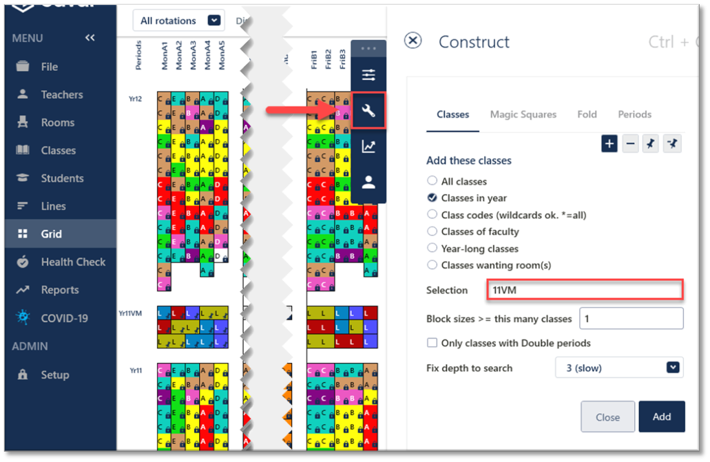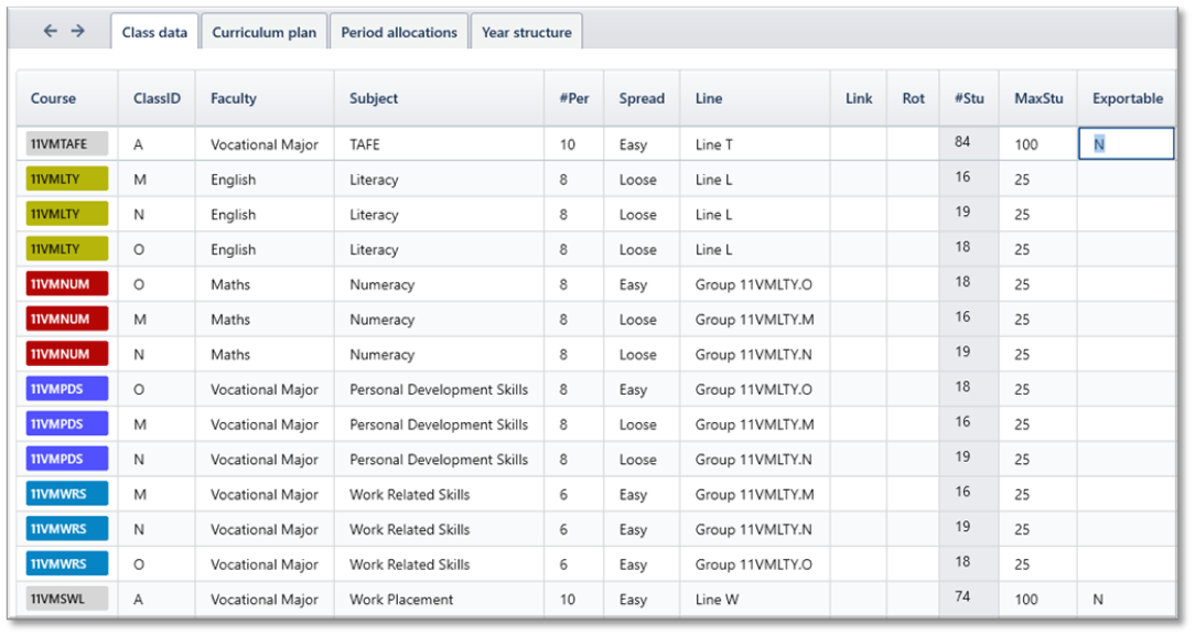All periods of the cycle must be accounted for. If the school has 50 periods per cycle, then the number of periods for the VM classes must add up to 50 periods. This may mean adding 'classes' such as 'TAFE' or 'Work Placement', to account for the time that students are offsite. These classes can be flagged so that they are not sent to external systems by selecting Class data (F6) > View > Exportable and entering N in this cell.