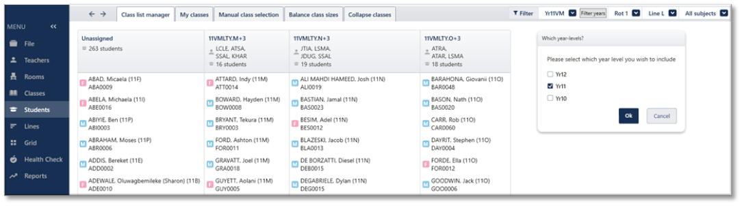 Drag and drop the students from the Unassigned column into the Line 1 class. Once a student is entered, they are then automatically registered to all other VM classes that have been grouped to that class. There is no need to add them to the grouped classes. Any other classes running on lines will need to be done through Class List Manager, choosing the appropriate Line number. A tip is to check a student's timetable for gaps, and see if there are any classes missing that should show.