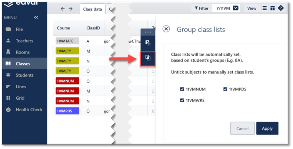 In Classes > Class data (F6) > VM year level, go to the Action bar > Group class lists and check if these classes have been ticked to tell Edval to manage the class list enrolments according to your grouping entries.