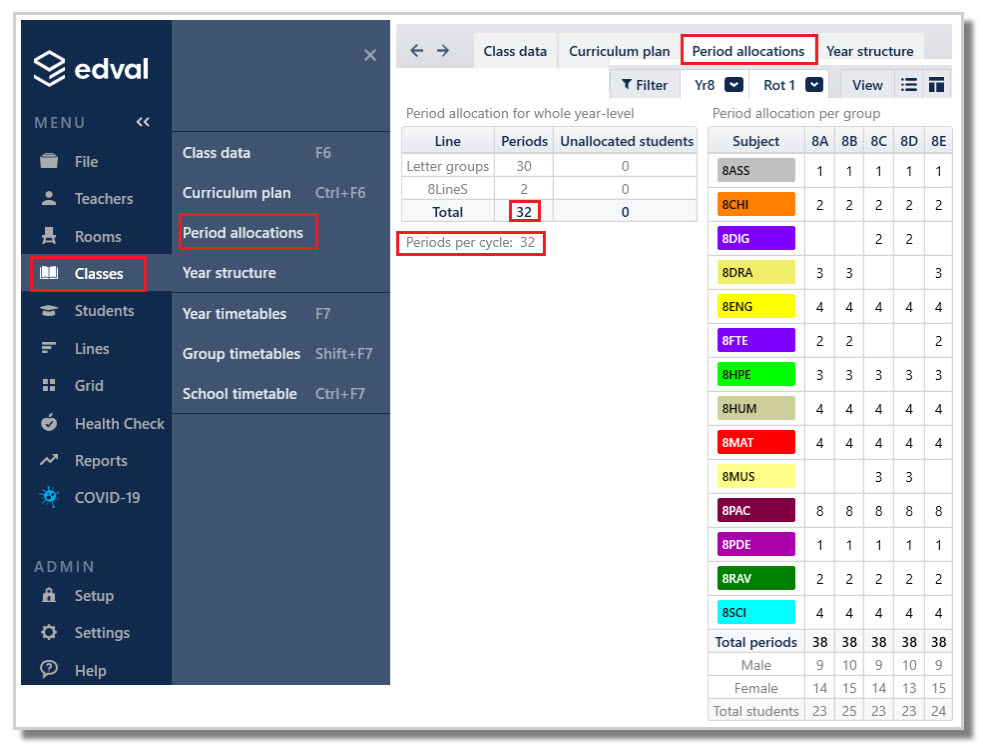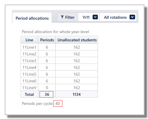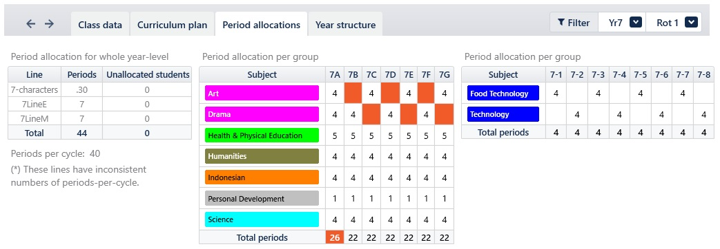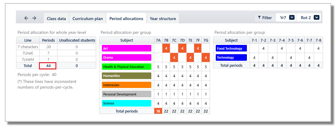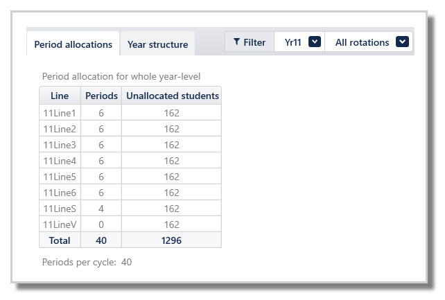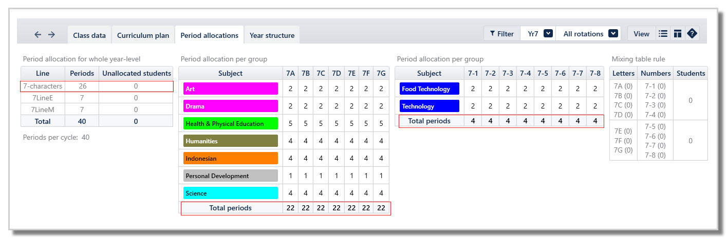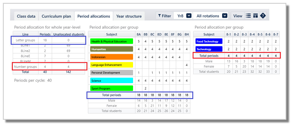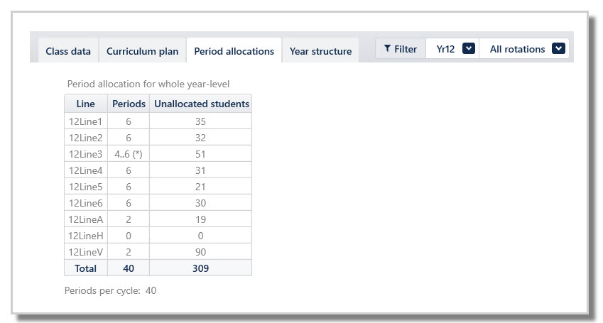 The Period allocations screen displays a breakdown of the year level's classes, grouped by structure, eg lines, letter groups and number groups, and gives the overall total of periods that need to be timetabled onto the grid. It is used for checking, prior to constructing a timetable, that each line and/or class group has the required number of periods for each subject, and that the total number of periods defined for the year level matches the total number of online (white) teaching periods on the Grid structure.