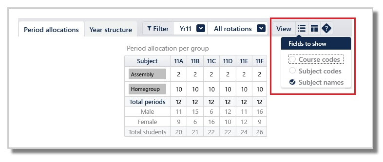 - Use View> Fields to show menu to select a preferred view, choosing between Course codes, Subject codes or Subject names.
