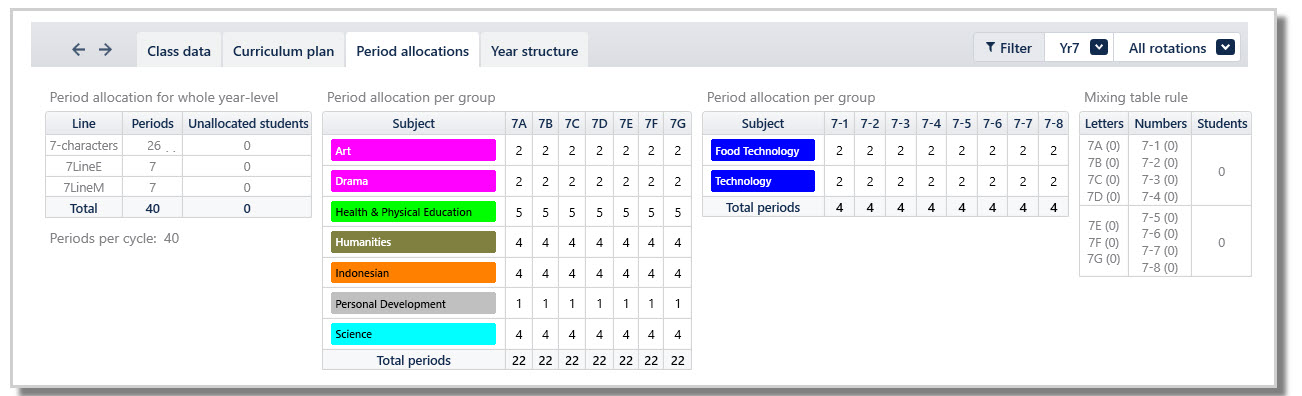 In this Yr 7 example, classes are made up of a mixture of lined classes, letter group classes and number group classes. There is also a Mix groups rule in place, so four tables display.