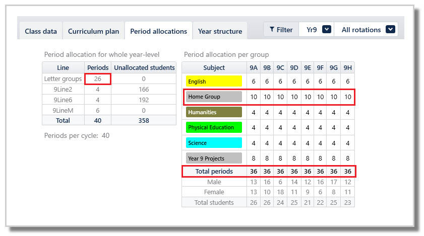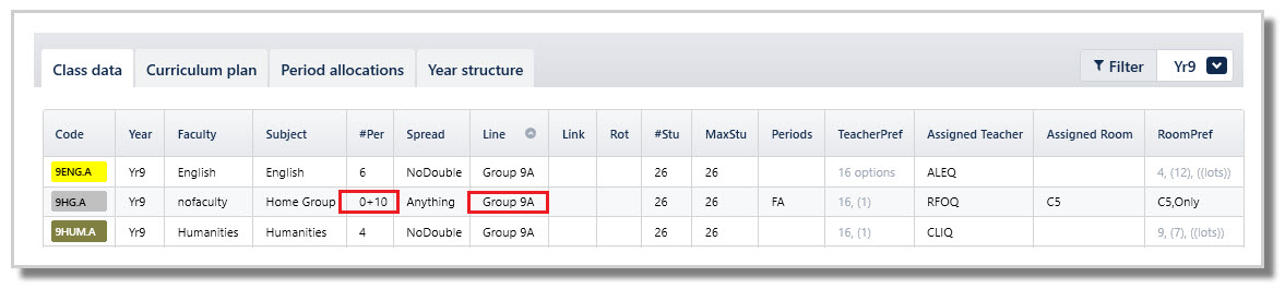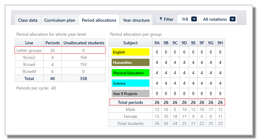 In this Yr 9 example, classes are made up of a mixture of lined classes and letter group classes, so two tables displayed.