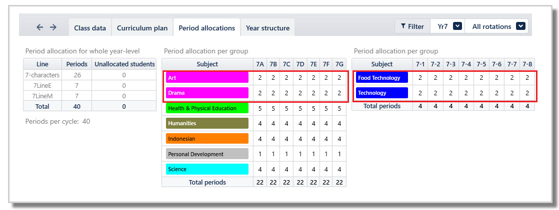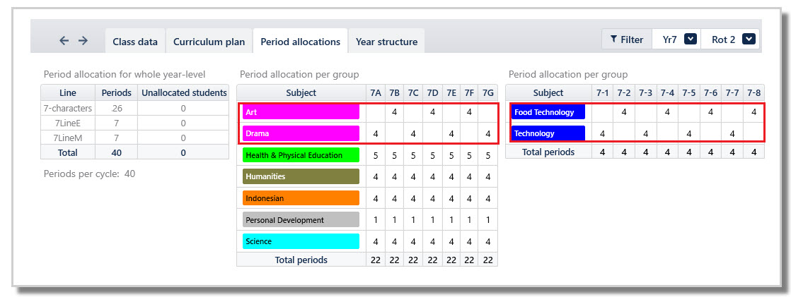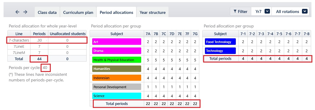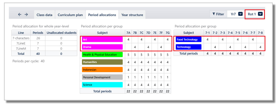 The data in the Rot column in Class data must be corrected to give 7A the correct number of periods each rotation.