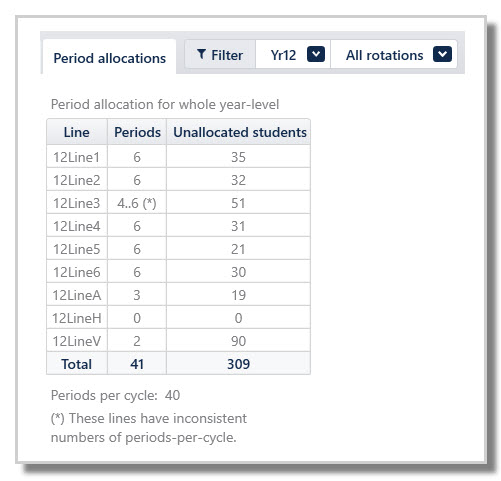 In this Yr 12 example, all classes exist on lines. Therefore, only the first table is needed. It lists each line, and the number of periods on each line, totalling them up at the bottom.