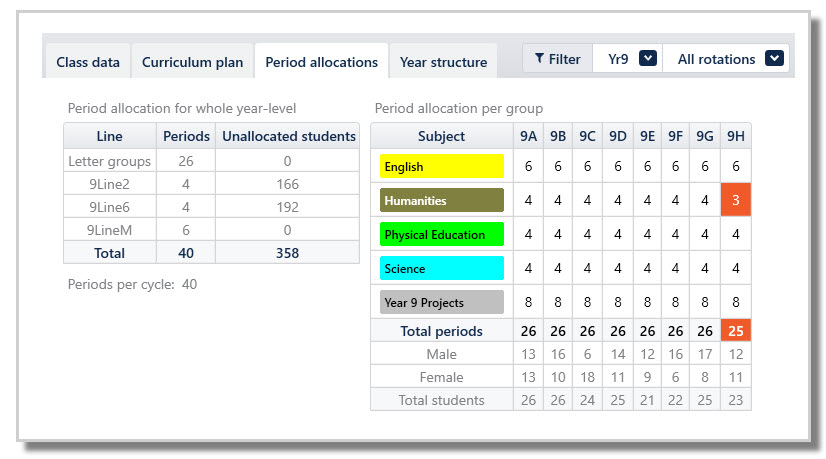 The below Yr 9 Period allocations screen shows an orange warning for the Humanities subject for 9H. All other group classes have 4 periods for Humanities, but 9H only has 3. 9H would ultimately have a timetable that has one blank period with no class to be placed in it.