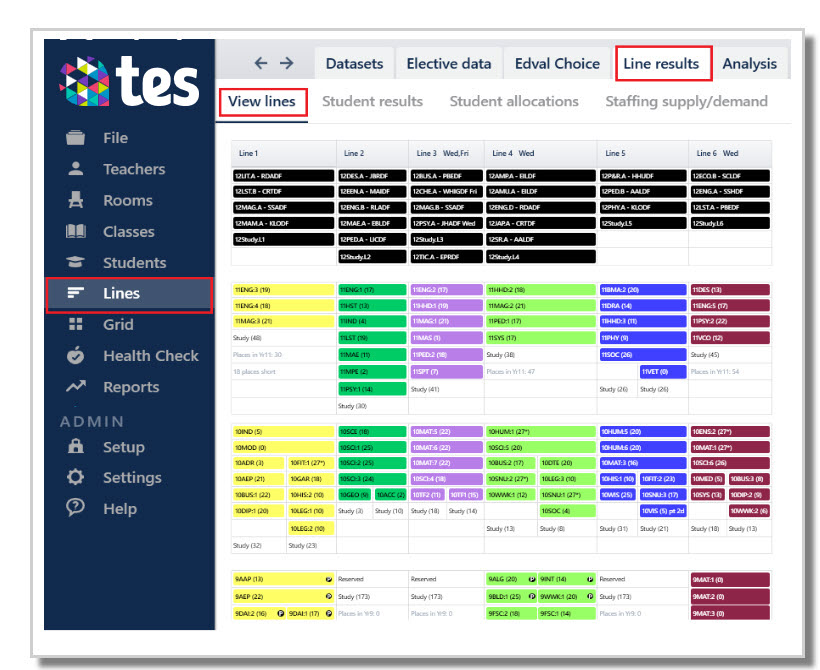 Often the first few attempts at generating lines will highlight missing or incorrect data. Any incorrect data is fixed and lines generated again until a good set of elective lines are achieved. - Create classes from the lines. (Lines > Lines results > View lines > Action bar: Create classes)
