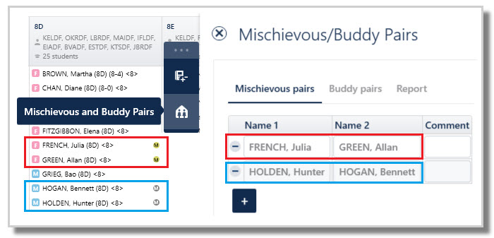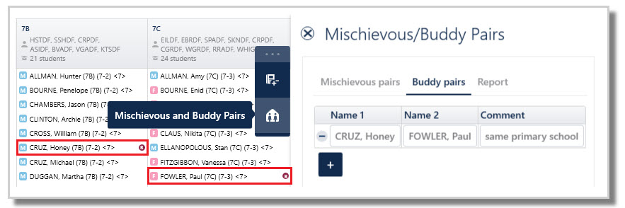 The Mischievous and Buddy Pairs features involve first establishing pairs of students who should be kept either separated into different classes or together in the same classes.