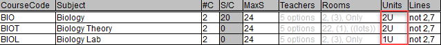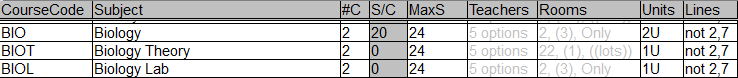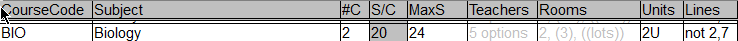 In this example, we will create 2 sub components for each class of the Biology course; a BIOT for a theory component and a BIOL for a lab component. After translation, the master course will not exist, so you need to make sure that the #C, MaxS, Teachers, Rooms and Lines values are set for the sub components accordingly.