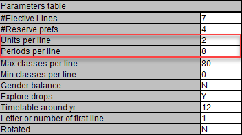 The Unit count is important, the 'Units' value against the sub components MUST total the 'Units' value entered for the master course. In this case, both of our sub-components will be 1U each, which means they will run for half a line (4 periods each), based on the Units per Line and Periods per line settings in the Parameters table: