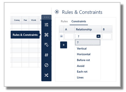 The vertical constraint forces one or more classes to run in the same line. The Constraints action is needed when, as per the above example, the constraint does not apply to all classes of a course.