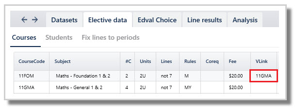 Some of these constraints (Vertical, Horizontal and Lines) may be stipulated in the Lines > Elective data > Courses screen using the relevant Lines, VLink or HLink columns. Entering data in the Courses screen enforces the constraint to work at a course level ie the constraint applies to the entire number of classes running of the course, not at individual class level.