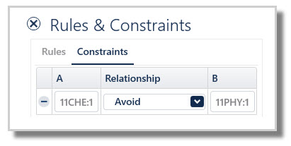 Note: This constraint should rarely need to be used, because normally the student choices and/or the resource requirements automatically keep the relevant courses apart. If you find yourself using 'avoid', then consider whether the Subject Teachers and Subject Rooms data is correct, as it is creating unnecessary work to have to enter these extra constraints when the Subject Teachers and Subject Rooms features are designed to manage this.