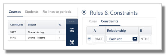 The school is running one semester length (one unit) course of 9ACT and one semester length (one unit) course of 9THE. The school wants these classes to run in different rotations so that they can assign the same teacher to each class, but they do not necessarily need these classes to run in the same line. The 'Each rot' constraint will ensure this outcome is achieved.