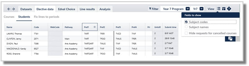 Submit time | Only relevant to schools using Edval Choice. The date and time each student has last entered or modified their Edval Choice subject preferences. This field is populated on syncing the form (Lines > Elective data > Students > Action: Download student choices from Edval Choice). No entry here means they have not submitted any preferences online. TIP: Sorting this column easily highlights all students who have not yet submitted. |