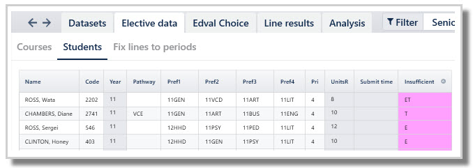 Insufficient | Students are highlighted if they have violated any rules and the group rule that has been violated display. Eg If a rule exists - Min 2 units of group E (English) - then any student who does not have a group E course listed in their preferences will appear with Insufficient = 'E'. Note that it is not possible for students to submit an insufficient course when using Edval Choice. ![]() |