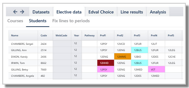 Note that the apricot, brown and pink violations are not possible when students submit their preferences in Edval Choice. Presumably manual entries have occurred.