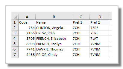 2. one row per student, including their student code, name and preferences listed in preference order.  The student name is not necessary for the import but may assist with data checking. Include a year level if importing into a multi-year dataset.