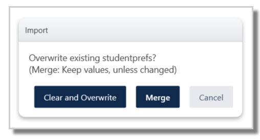 Merge: New students and their preferences will be added, while any existing preferences for existing students will be altered to match the incoming data from the spreadsheet, as per the headings.