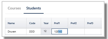 Course codes can be typed directly into cells. Once the code is recognised, Edval will complete the code entry, so the user does not need to type the entire code and can move out of the cell.