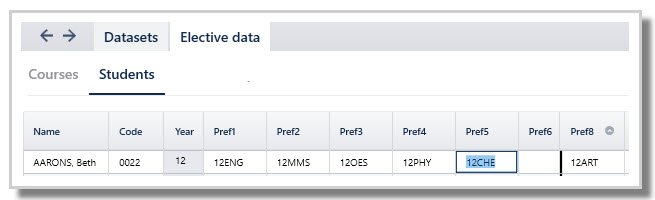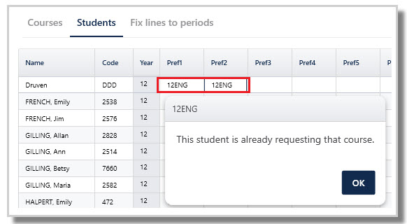 Note that it is not possible to enter a code if the same code exists somewhere else in the student's preferences. The original code would need to be first deleted before entering the code into a different preference cell.