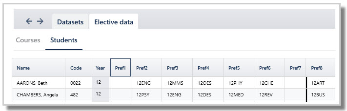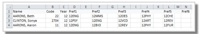 NB: Depending on the dataset set up, the export may contain column gaps, as seen below, which must be corrected prior to importing. Ensure that the data has student preferences exactly as they should be imported in.