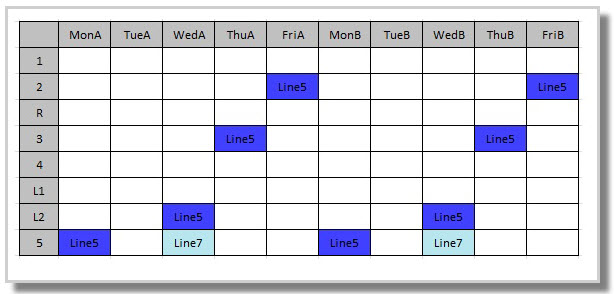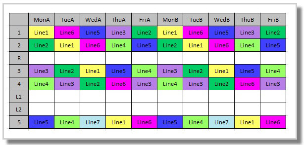 The Lines to periods feature is particularly useful where datasets containing classes with part time staff should not be placed on lines that run on their stipulated day(s) off. Stipulated days off must exist in Teachers > Teacher data F2.