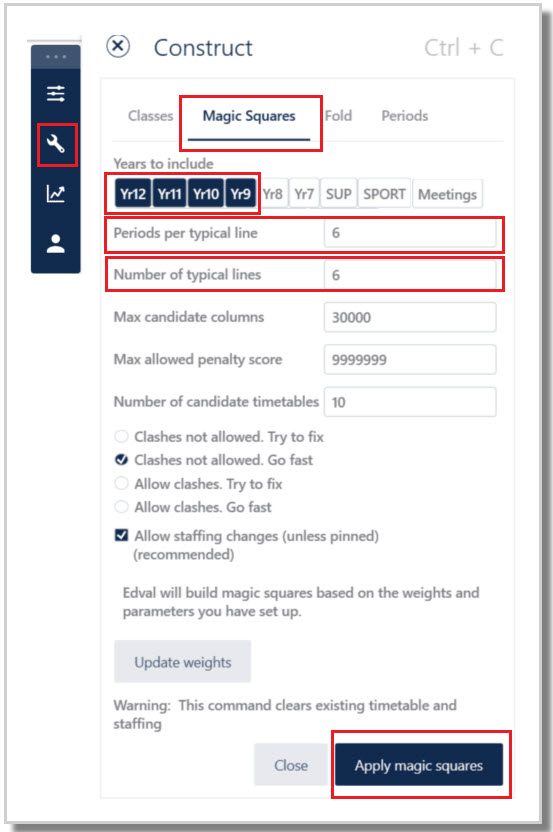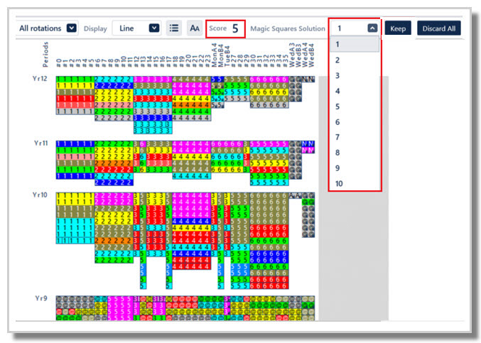 The Magic squares method will try to find a way to bring together each year level's independently generated lines in the Master grid. It will clear any previously assigned staffing (except where classes are hard coded to teachers) to look for a successful staffing and timetabling solution.