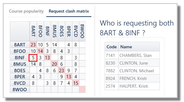 Double-click a cell to see which students requested both courses.