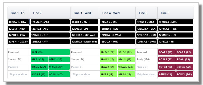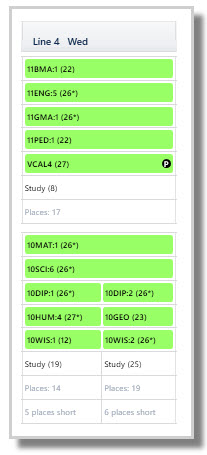 If each class on the line was to be filled to capacity, the 'Places' warning will show if there is room for 11 or less students. This is particularly helpful to ensure that in years where all students must be in a class in every line they can actually fit into a class, and also when considering how many new students could be accepted into the school and placed into classes.