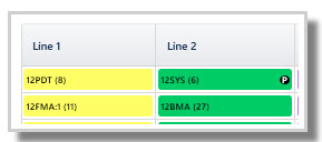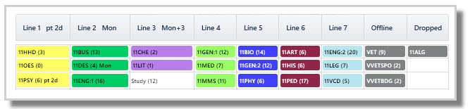 Part time staff restraints are highlighted at the top of the line if the line contains a class that requires a part time teacher as the only teacher option. The class itself will also display the part time restraint.