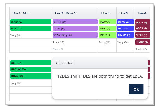 In the example below, 12DES was in the dropped column, and manually placed onto Line 2. The message highlights the issue; the only teacher option for this class (EBLA) is already teaching in that line (11DES).