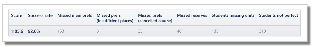 Sum student scores: The total of all penalty scores assigned to students who did not receive their main preferences (found in the Students results screen).