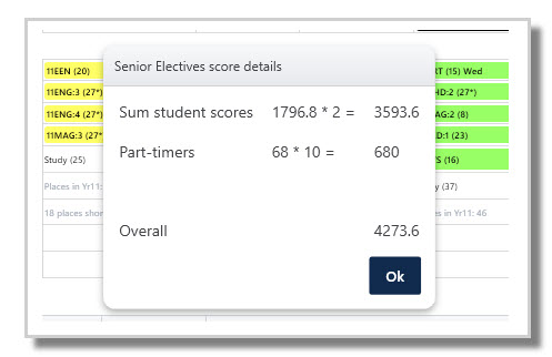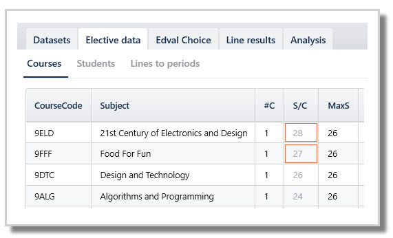 - Each class shows the number of students in the class in brackets eg (23). If the class is at capacity (as entered in the Elective data > Courses > MaxS column), an asterisk will show after the number eg (25*).
