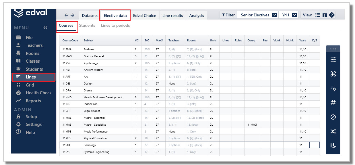 One of the steps in building a timetable for secondary schools is to create/generate elective lines. This is done in the 'Lines' menu of Edval, and involves: