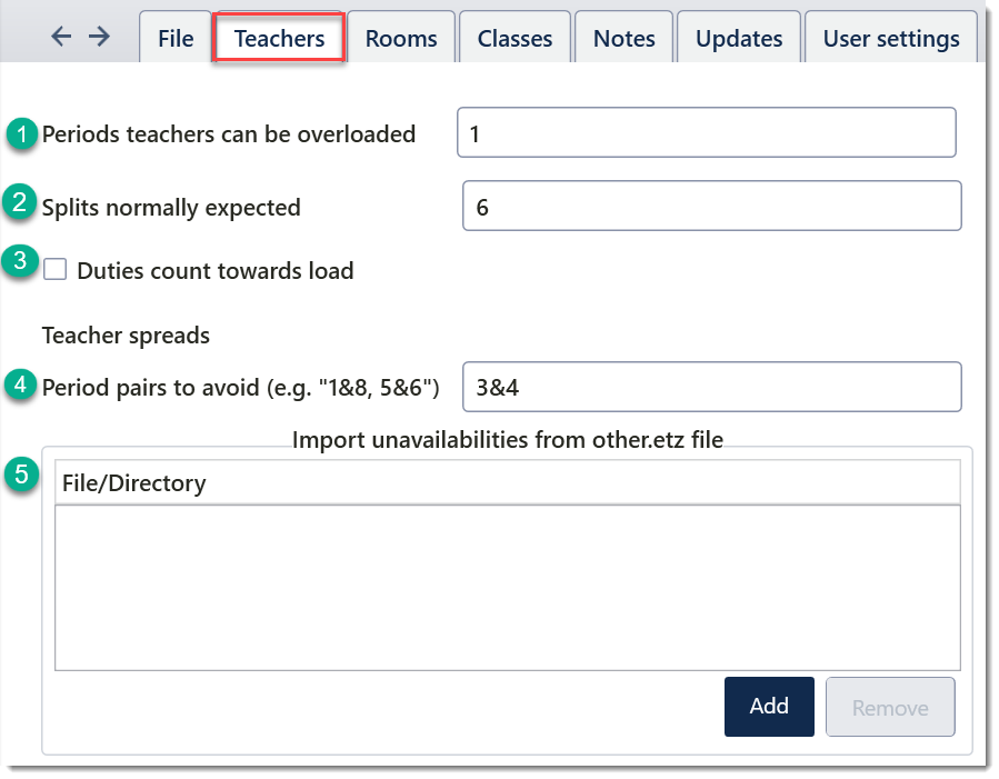 Most schools will NOT use this setting, as teachers are allocated a standard number of yard duties, and not counted towards the load. Variations in the amount of yard duties are managed in Teachers > Duty rosters > Duty loads. 4. Teacher spreads- Period pairs to avoid